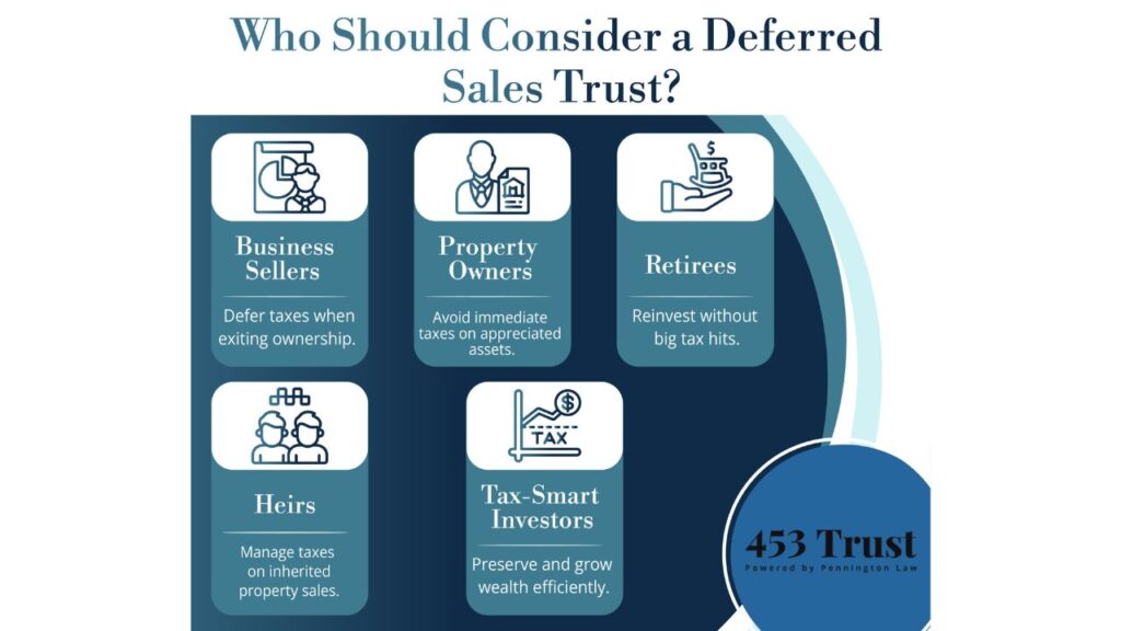A deferred sales trust is an excellent option for anyone who wants to manage large capital gains and their tax implications effectively. For example, business owners planning to sell their companies can benefit significantly as they transition out of business ownership. Many people with investment properties that have significantly appreciated, such as market investments, also find deferred sales trusts useful to delay capital gains taxes and reallocate their assets more strategically.