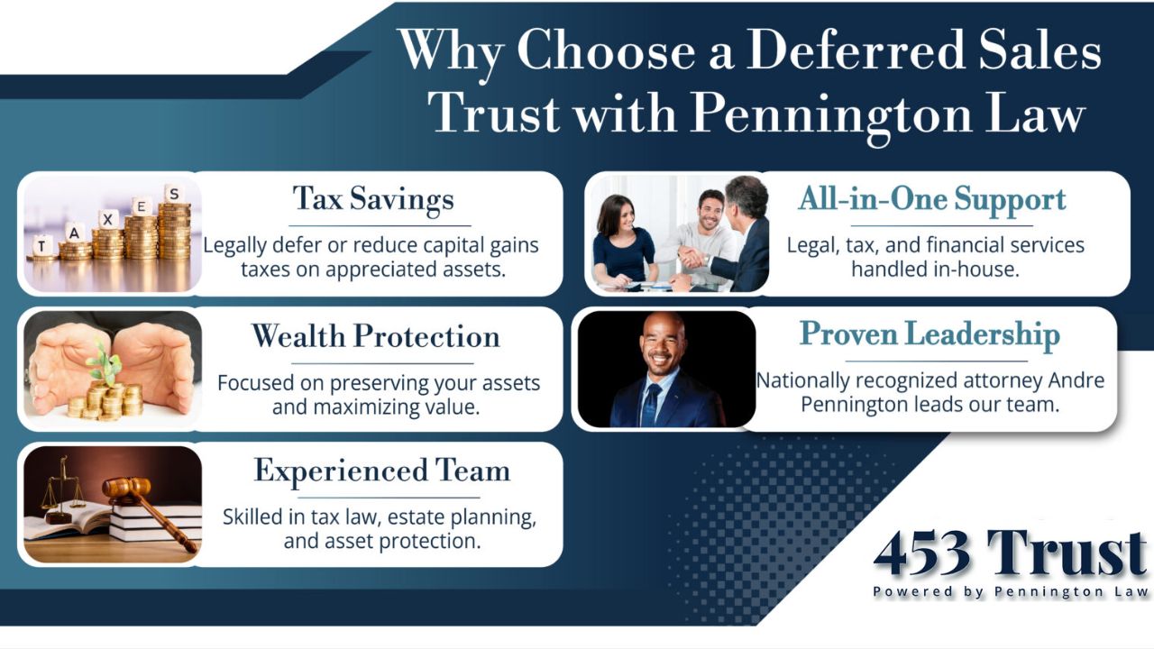 Setting up a deferred sales trust requires extensive knowledge and experience with complex tax and trust laws. Choose 453 Trust Powered by Pennington Law to help you manage the tax implications of an asset sale because: